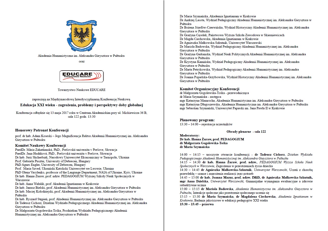 Wraz z Akademią Humanistyczną im. Aleksandra Gieysztora w Pułtusku oraz Towarzystwem Naukowym EDUCARE jest mi niezmiernie miło zaprosić Państwa na Międzynarodową Interdyscyplinarną Konferencję Naukową: Edukacja XXI wieku – zagrożenia, problemy i perspektywy doby globalnej podczas której wygłoszę referat pt.: Muzyka sakralna XXI wieku.